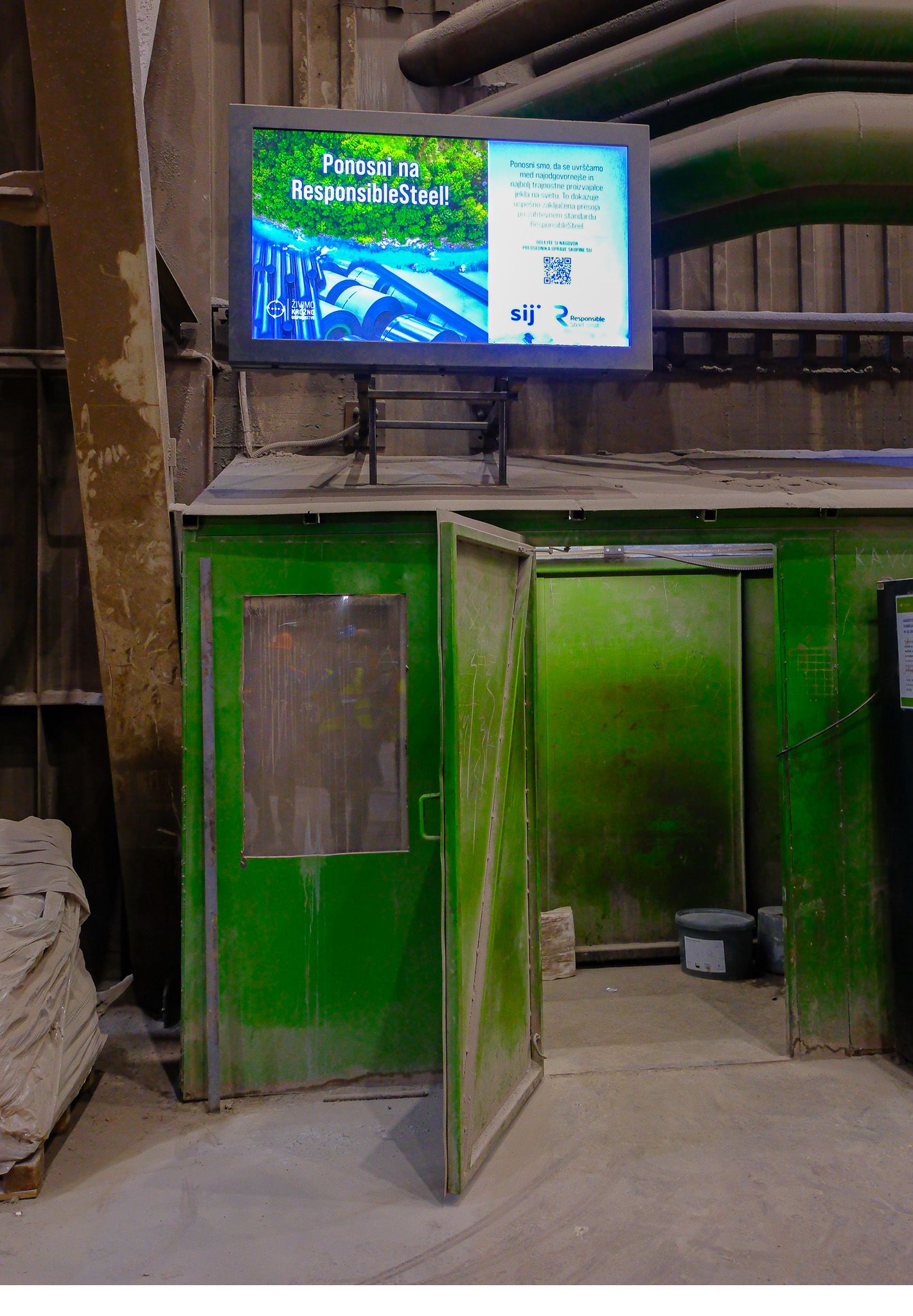 A screen in the SIJ Acroni plant displaying a message about the site's Core Site Certification. Image: ResponsibleSteel/Joe Woodruff